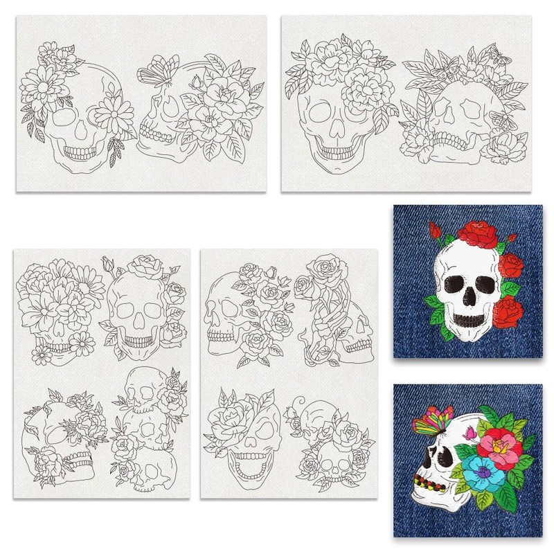 BENECREAT 4Sheets A4 Water Soluble Stabilizers, Skull Flowers Combo Embroidery 12 Patterns Paper Tear Away Stick and Stitch Stabilizers for Embroidery Sewing Lover, 297x210mm