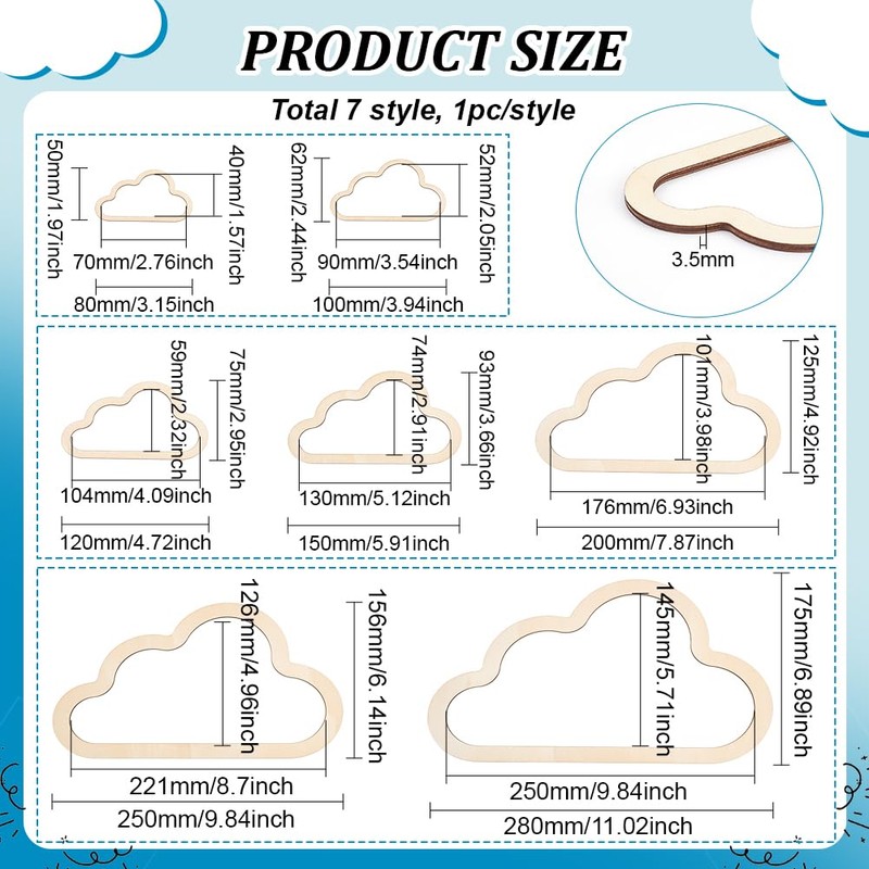 BENECREAT 7 Sizes Wooden Cloud Outline, Cloud Macrame Frame, Wooden Hoops, Rings, Macrame Art Frame, Weaving, Macrame for DIY, Home Wall Hanging, Wreath Decoration, 3.5 mm Thick