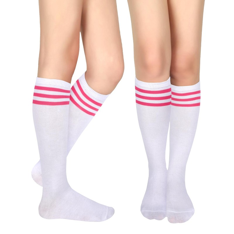 Benefeet Sox Knee High Socks for Women Girls Striped White Knee Socks Long Cotton Athletic Tube Socks Casual Outdoor Sport Nurse Costume High Socks Soccer Stocking, White Hot Pink