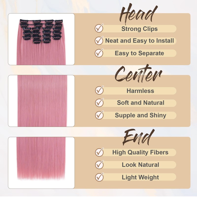 Benehair 22" Clip in Hair Extensions 12 Pcs Long Straight Hair Extensions Clip in Synthetic Fiber Full Head Natural Extension Pink Hair Piece for Women(Pink, 180g)