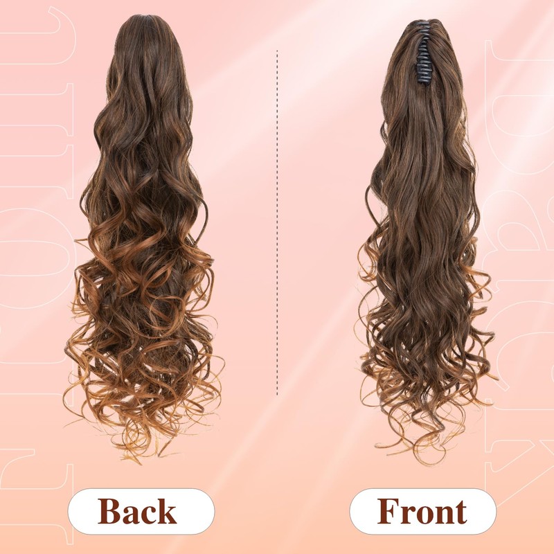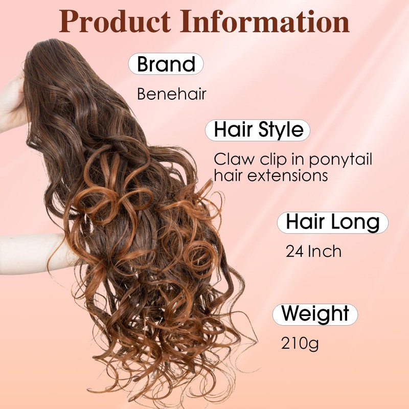 Benehair Claw Clip in Ponytail Hair Extensions 24 Inches Long Curly Wavy Ponytail Extensions Synthetic Drawstring Ponytail Hair Pieces for Women(Dark Brown to Light Auburn Brown, 210g)