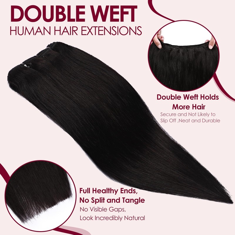 Benehair Double Weft Straight Silky Remy Invisible Sew in Hair 26 Inch 100g Real Human Hair Weft Extensions #1B Natural Black