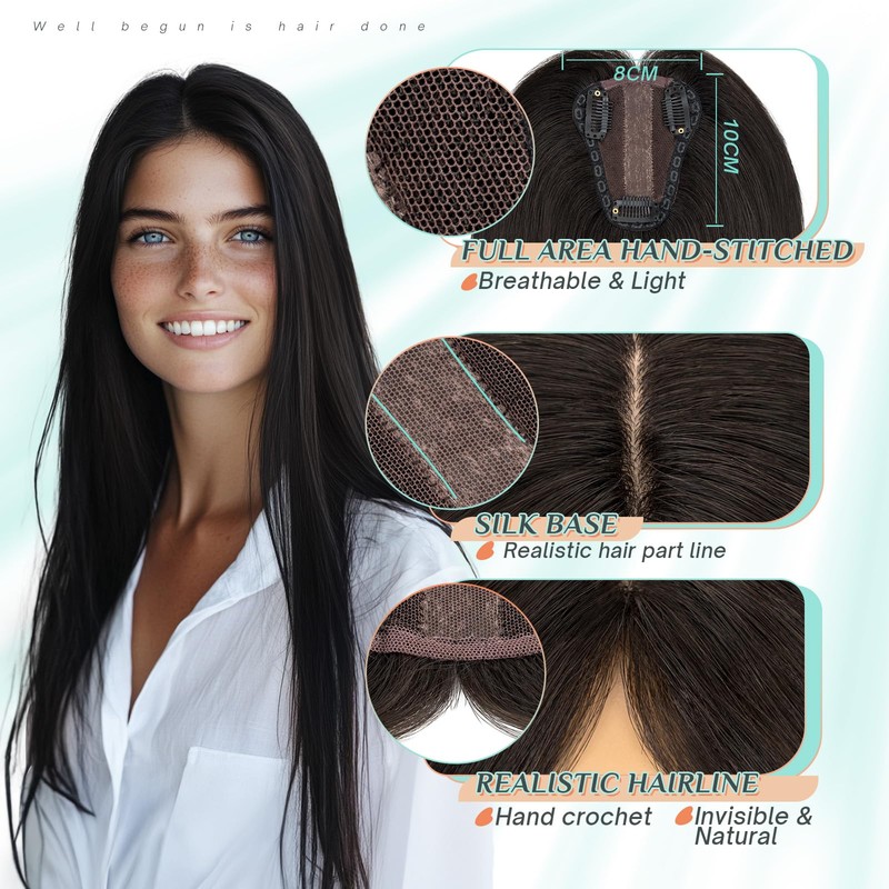 - Invisible & Lightweight: Compared with other similar products, Our toppers with a silk base provide the most natural look, closely resembling a real human scalp, ensuring your secret stays safe. Unlike heavy and thick hair topper that cover the entire head, our hair toppers for women(10"-30g, 12"-35g) are smaller and lighter hairpieces, which makes them more lightweight and comfortable