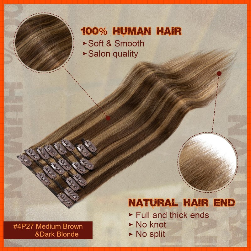 Benehair Human Hair Clip in Extensions Balayage Medium Brown Mix Dark Blonde Highlight Hair Extensions for Women Long Straight Remy Natural Full Head 8pcs 10inch No Tape No Glue #4P27