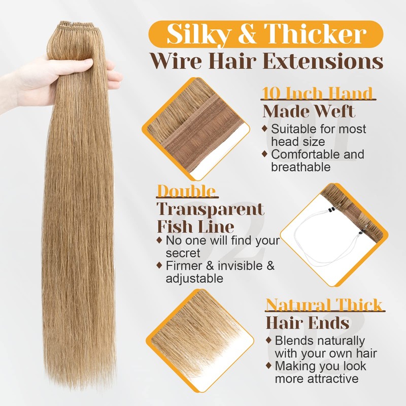 Benehair Human Hair Extensions Thick Ends Invisible Wire Real Human Hair with 2 Fish Lines Thicker Hairpieces 20inch 110g Dark Blonde Hair Extensions Straight Thicker Hairpieces for Women #27