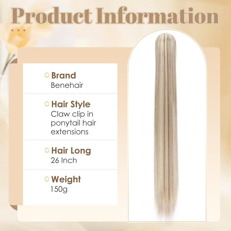 Benehair Ponytail Hairpiece, 66 cm Braid Extension with Clip, Straight, Long Ponytail Extension Hair Extension Clip, Synthetic Hair Extension for Women (Light Brown Mixed with Blonde, 150 g)