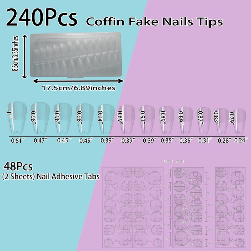 BenePoint 240Pcs Coffin Fake Nails Tips, Clear Gel Nail Tips Coffin Press On Nails with Storage Box& 48Pcs (2 Sheets) Nail Adhesive Tabs, Reusable False Nail Tips Acrylic Nail Tips(Coffin, Short)