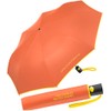 The colour of the roof is orange-yellow. The material used is 100% polyester. Small and stable, the pocket umbrella weighs only approx. 357 grams. When open, the roof is 95 cm tall. When closed, it measures 28 cm.