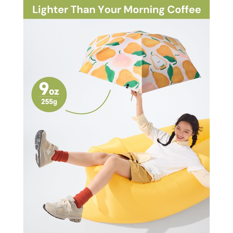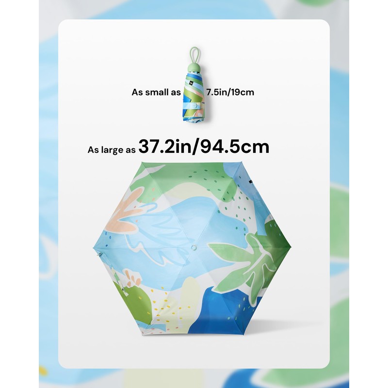 - 【Effortless Portability】Easily slip it into tight spaces: folding down to just 7.5in/19cm (about the size of a 12oz soda can), yet expanding to offer 37.2in/94.5cm of wide coverage. Weighing only 9oz/255g, the mini umbrella lighter than 2 bananas, making it perfect for backpacks, stroller baskets, or side pockets of your work tote.