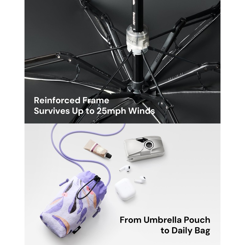 - 【Windproof & Durable】The reinforced frame withstands Beaufort 4-5 winds, delivering reliable wind resistance in gusty conditions. Engineered for 1,500+ smooth open/close cycles, this small umbrella can handle the toughest weather without skipping a beat.