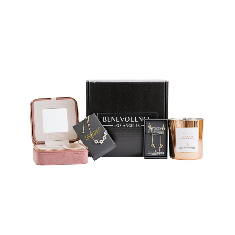 Benevolence LA Mama Gift Set | Travel Jewelry Case - Dusty Pink, MAMA Necklace & MAMA Bracelet, Lilac & Rose Scented Candle, 8 oz | Mom Gift Box, Mother's Day Gifts for Mom