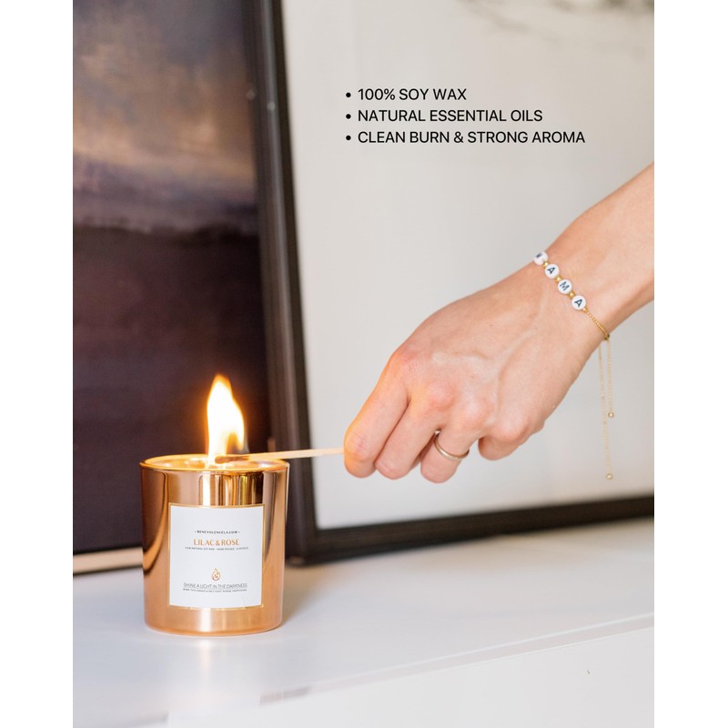 - LILAC & ROSE SOY SCENTED CANDLE– Help her unwind and enjoy a moment of peace with the calming scent of Lilac & Rose. Made of 100% soy wax and strong essential oils, this lovely aroma candle will transform any space with its beautiful floral fragrance. Featuring a wood wick that will make the experience even more magical.