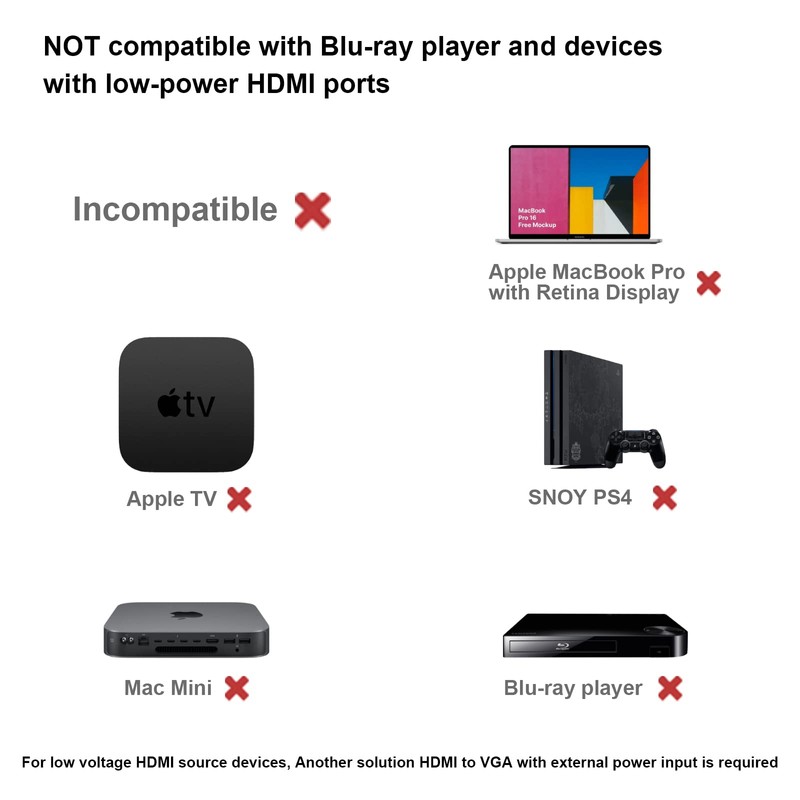 - BROAD COMPATIBILITY - The HDMI-VGA adapter is compatible with computer, pc, desktop, laptop, ultrabook, notebook, Chromebook, Raspberry Pi, Intel Nuc, Roku, PS3, Xbox One, Xbox 360, Wii U, Set Top Box, TV BOX, or other devices with HDMI port; ✅NOT compatible with Blu-ray player and devices with low-power HDMI ports such as SONY PS4, Apple MacBook Pro with Retina Display, Mac mini, and Apple TV; For the low-power HDMI devices, please refer to - https://www.amazon.com/dp/B01KLKQN9U