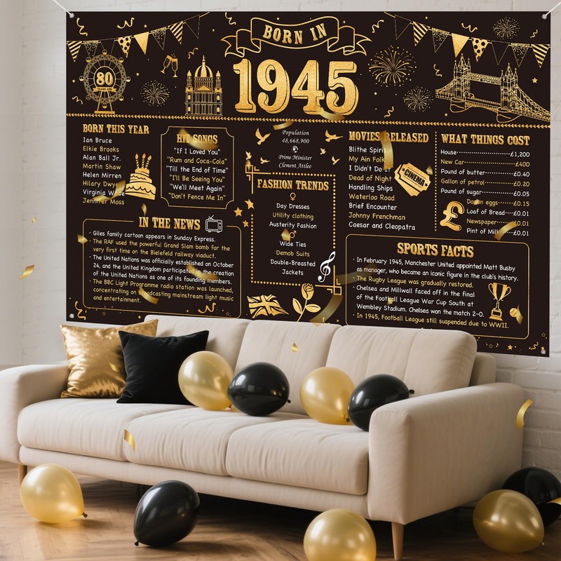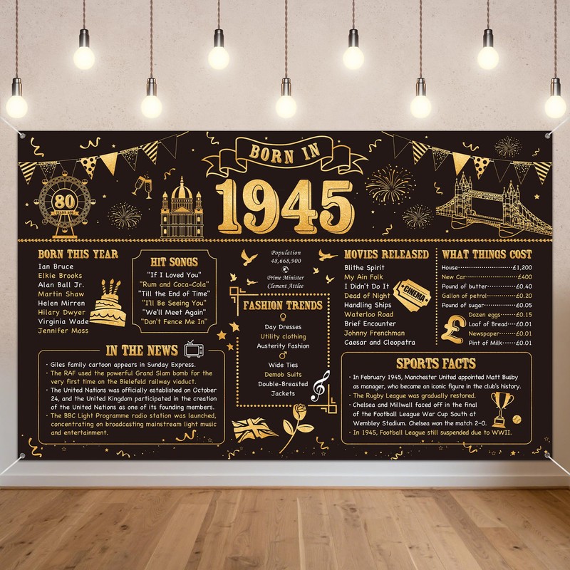 - 【 Nostalgic 1945 UK Timeline】Relive special memories with printed highlights of 1945 - hit songs, blockbuster films, UK landmarks, sports events and fascinating facts about prices and population trends. Make this born in 1945 UK birthday background banner a perfect conversation starter at parties