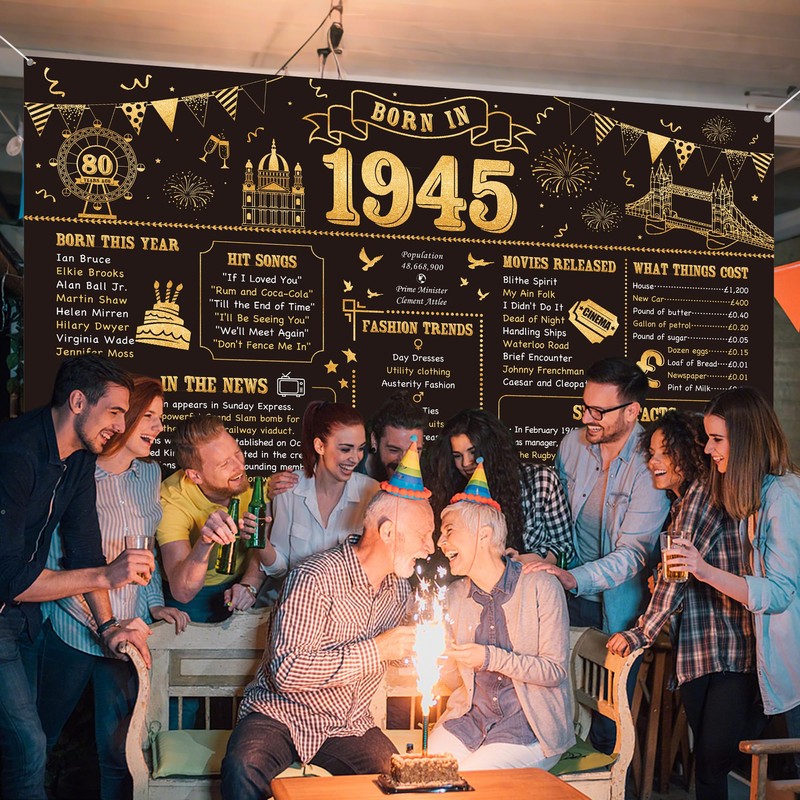 - 【 Versatile Vintage Decor】Perfect as a photo backdrop, wall decor or cake table display. Complements all 80th birthday party themes and pairs beautifully with balloons and streamers. Beyond birthdays, this born in 1945 UK backdrop sign in poster ideal for anniversaries, family gathering, class reunions and retro-themed parties