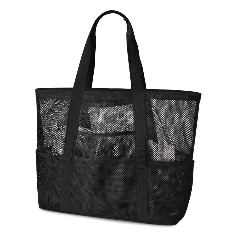 - [Mesh-designed tote bag for better breathability and portability] : The mesh design keeps the interior dry and keeps towels and clothes from staying wet all the time. Constructed of durable 600D Polyester and mesh that won't break or tear easily from normal use and wear and withstands up to 160 lbs. easy to fold. Coupled with 9 inch-long comfortable straps so you can use it easily. Perfect for your travel or vacation carry-on