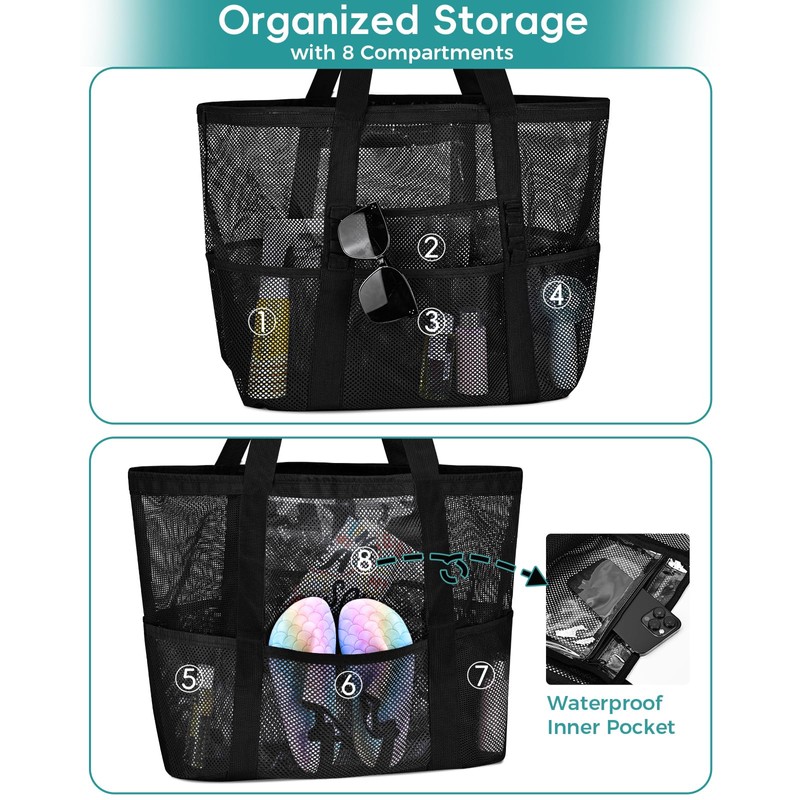 - [Utilize 8 Compartments+1 Waterproof PVC Zippered Pocket for Organized Storage] : Beach tote bag has 8 big mesh pockets outside, front 4 large opening mesh pockets, and back 3. It can better sort and organize your items. A built-in zipper pocket inside beach bag that can keep your phone, wallet, and cards safe. 4 convenient rings in front of the large beach bag can hang your keys, bottle, cap and toy