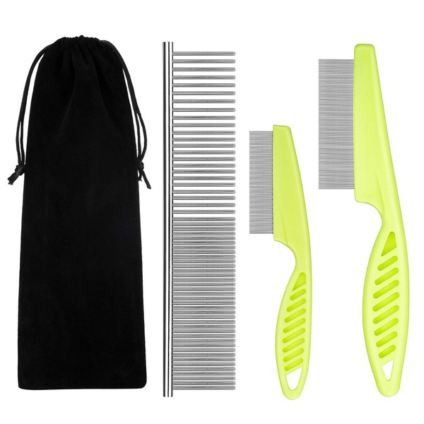 BENSEAO Flea Comb for Cats Dog Comb Lice Comb Metal Teeth Durable Tear Stain Dog Combs Remove Float Hair Combing Tangled Hair Dandruff Pet Comb Grooming Set 3 Pieces Add Storage Pouch (Green)