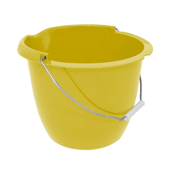 - 10 litre plastic bucket with plastic handle and pouring lip. Ergonomic handle grip for comfort when carrying. Easy to clean. Lightweight yet durable. DxH: 250x245mm. Yellow.