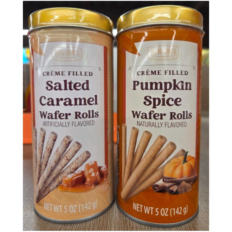 Bentons Crème Filed Wafer Rolls Salted Caramel & Pumpkin Spice 5oz 142g (Two Tins)