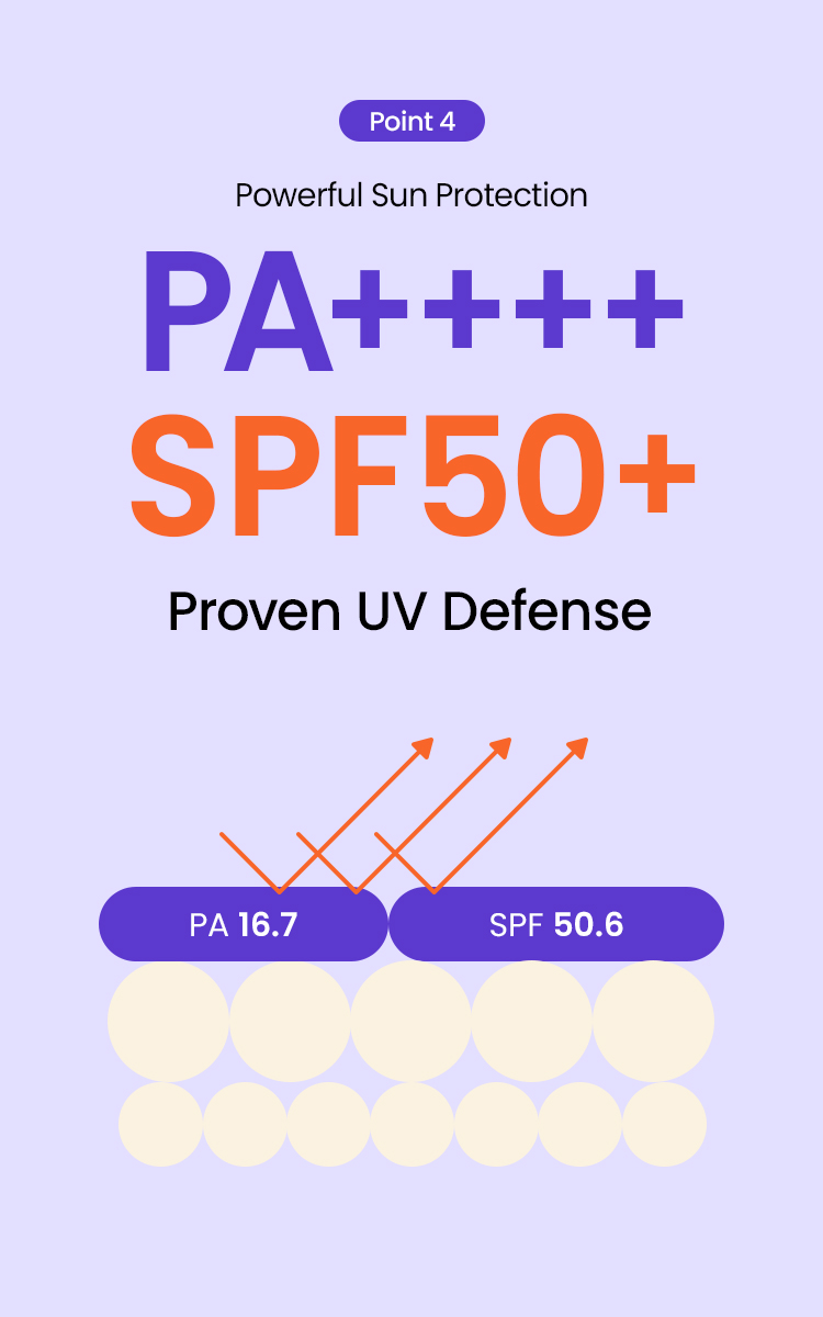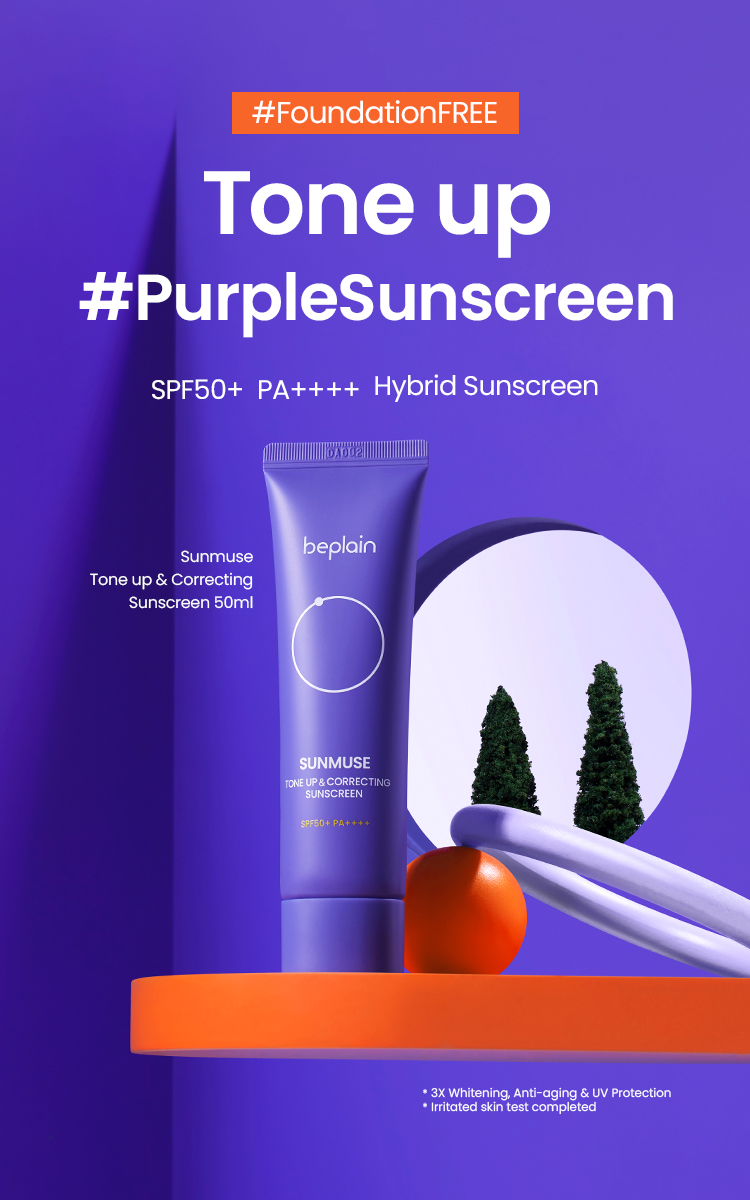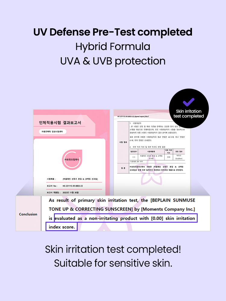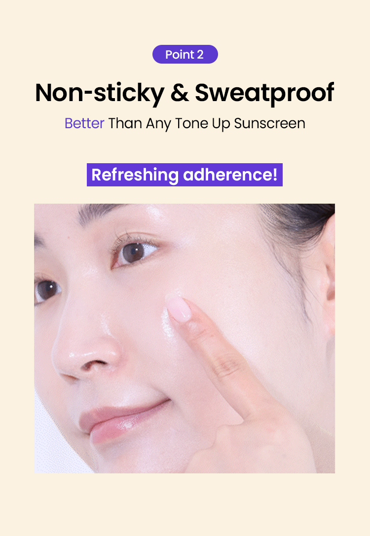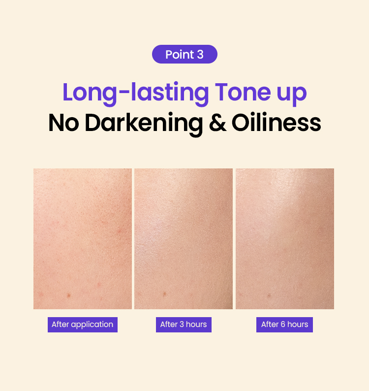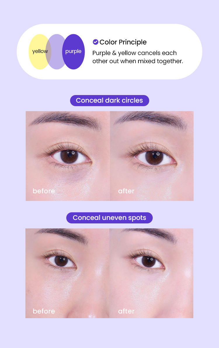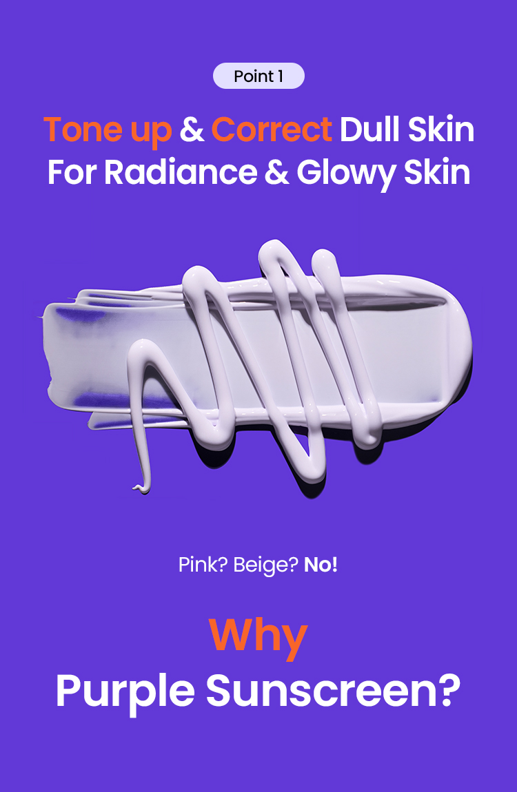 Purple, which is complementary color of yellow, corrects uneven skin tone to make even and bright skin. Purple consist of both red and blue that perfectly fits to any skin tone. Provides lightweight application with non-stuffy moisturizing adhesion. Provides long-lasting perfectly set skin tone up effect without any darkening and oiliness. The mixed physical and chemical sunscreen that completed pre-test in clinical UV ray blocking effectively blocks UVA and UVB. Completed skin irritation test for carefree use by sensitive skin types.