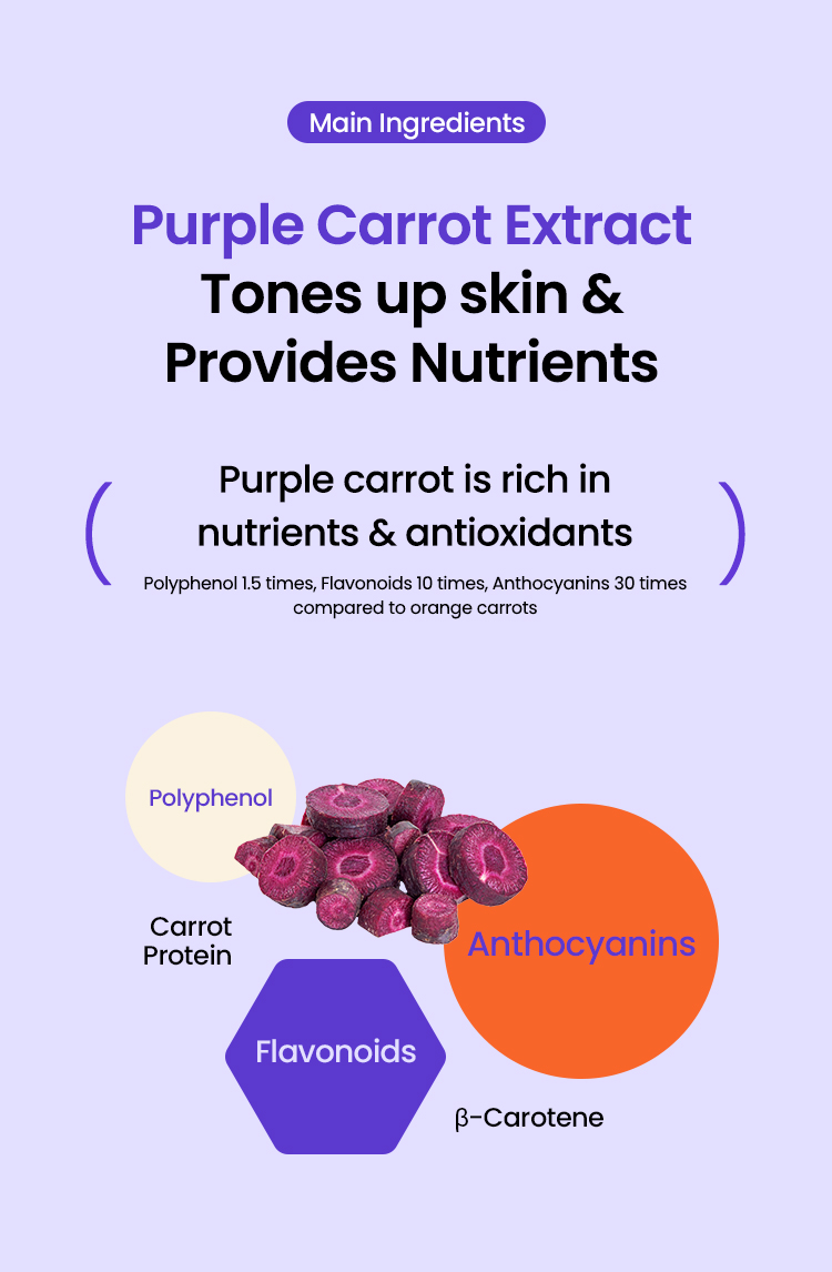 The purple carrot extract that has excellent nutrient contents compared to regular carrots provides skin tone up, skin tone correction, and skin nourishing.