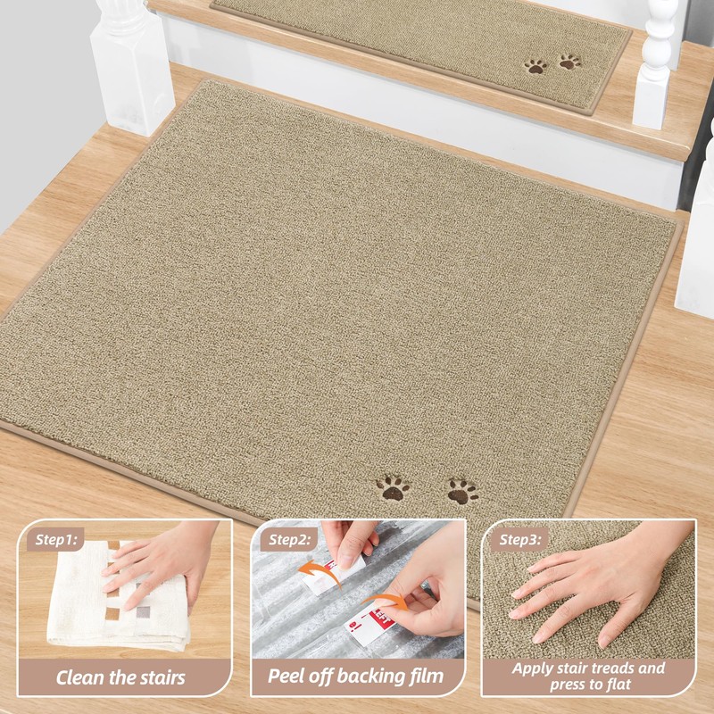 - Easy to Install: Just clean the surface of the stairs, peel off the backing film, then place the stair landing rugs on the stairs and press them. No need double-sided tape, glue, or carpet tacks. Our stair landing mat can be reused many times, you can easily remove them without any glue residue and then reinstall it. If you have any problems during use, please feel free to contact us and we will try our best to help you