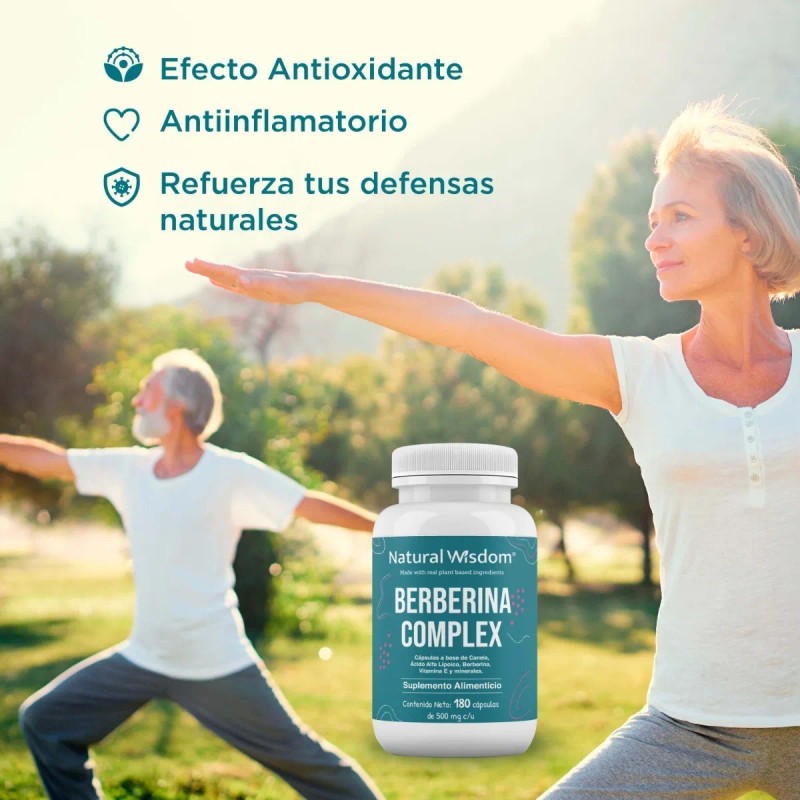 NATURAL WISDOM SUPLEMENTO BERBERINA COMPLEX | Articulaciones 180 Cápsulas - 180 porciones (1 pastilla x porción) SIN GLUTEN | SIN LACTEOS | SIN SOYA | GMO FREE En Natural Wisdom ayudamos a que las personas gocen de una vida más sana. Ingredientes naturales que ayudan a mantener niveles saludables de azúcar en sangre, un problema derivado de una mala alimentación y poco ejercicio. Ingredientes con un efecto antioxidante, antiinflamatorio y que ayuda a reforzar las defensas de tu cuerpo. CARACTERISTICAS Cantidad: 180 capsulas de 500mg Peso Frasco: 160g Dimensiones: 14. 5cm Apariencia: Cápsulas duras de Origen Vegetal USO RECOMENDADO Tomar 1 cápsula al día de preferencia al consumir alimentos. No exceder la porción recomendada Rinde aprox.