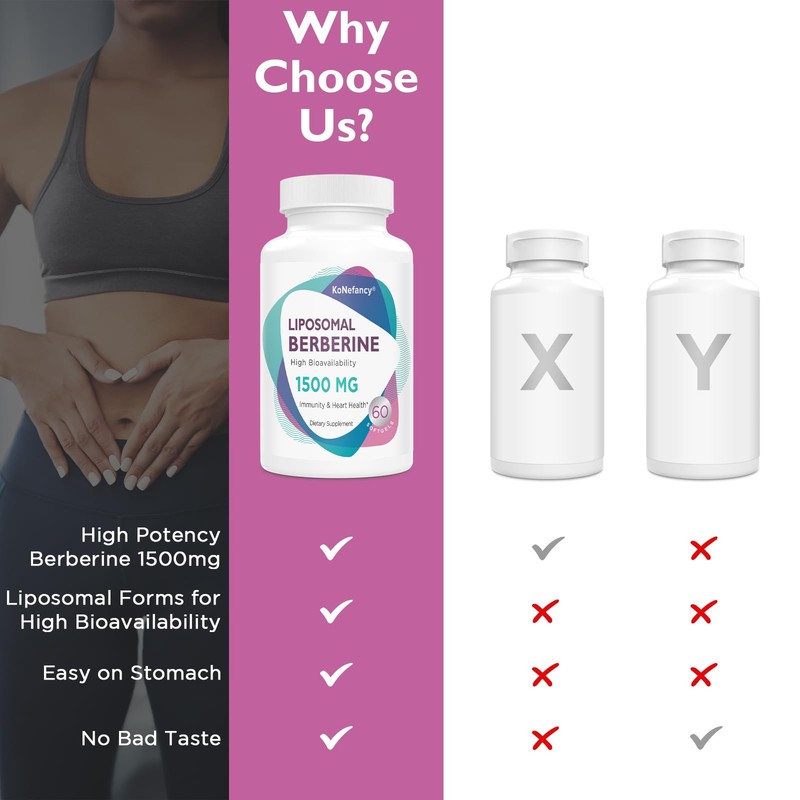- [Quality Guaranteed] Manufactured in the USA under the strictest quality controls, KoNefancy liposomal berberine supplements from pure, high quality and potency ingredients are 100% Non-GMO, Gluten-free, Soy-free, Wheat-free, Sugar-free, No Artificial Flavors.