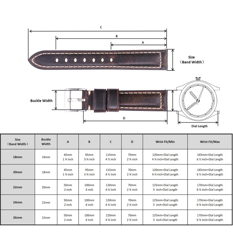 - WRIST FIT & PACKAGE: It is regular length, fit wrists approximately 6.5" to 8.25"(165mm-210mm) in circumference, but watch geometry also impacts fit. Band length--120mm/70mm(buckle not included). PACKAGE: Package included: 1x Watch Strap, 1x Spring Bar Tool, 2x Quick Release Spring Bars.