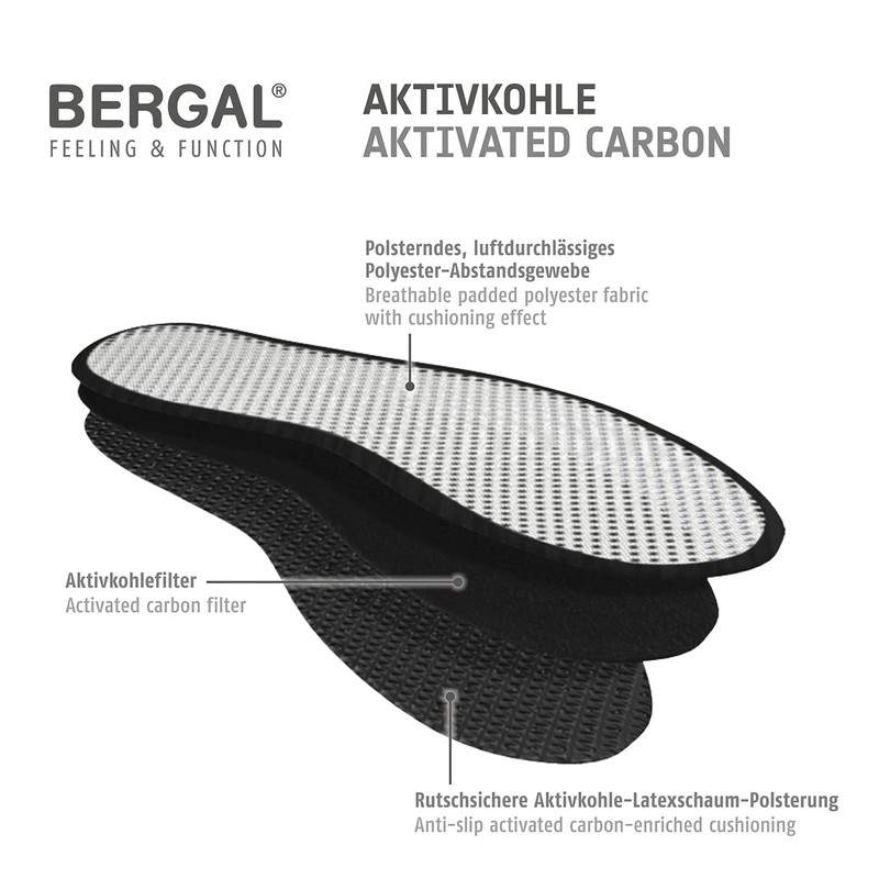 - Box contents: 3 pairs of activated carbon insoles from BERGAL in single size. Made in Europe. For best results, remove the existing shoe insole beforehand and replace it with the BERGAL shoe insole.