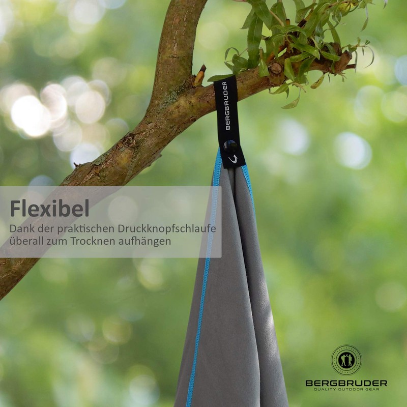 - Extremely absorbent and quick-drying. The microfibre towel can be used for approx. Absorbs 8 times more water and moisture and dries in the air up to 4 times faster. Thanks to the cleverly placed push button loop, the towel can be easily hung anywhere, making it dry even faster.