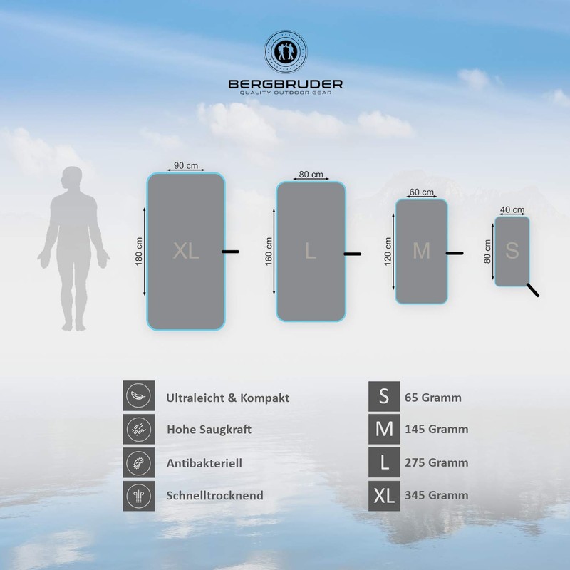 BERGBRUDER Microfibre Towels - Ultralight, Compact & Quick-Drying - Beach Towel, Bath Towel Set with Bag (Set SL = 1x S 80 x 40 cm and 1x L 160 x 80 cm, Grey/Blue)