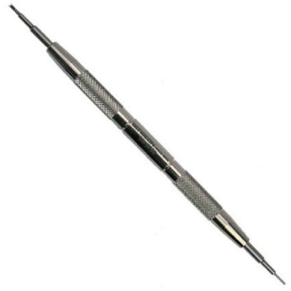 You can feel the quality built into this solid spring bar tool. Features stainless steel construction that feels sturdy in your hand. This fine quality steel spring bar tool with replaceable tips is designed to last a lifetime. It is the perfect tool for removing spring bars from metal and leather watch bands. The forked end works great for opening spring bars, and the pointed end is just right for compressing shouldered spring bars from the lug holes. The weight, handle knurls, and size make this watch tool ideal for the delicate job of adjusting the size of watch bands or repairing a watch clasp. Each tip is removable and has identical threading making it easy and convenient to change or replace the tips as necessary for repair work. .80mm pointed end 3.00mm fork end 5 1/2" overall length Durable interchangeable tips Replacement ends are available, product numbers: 6767-B(pointed) 6767-A(forked) Swiss made