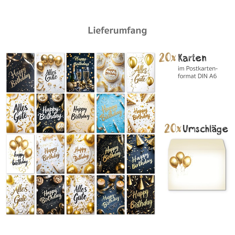 - What's in it: 20 birthday cards as a postcard set (DIN A6), including 20 matching beautiful envelopes, suitable for any birthday, happy birthday.