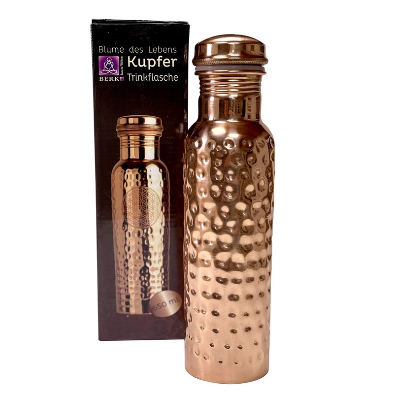 Hier zeigt das Kupfer was es kann! Wasser bleibt in kupfernen Flaschen länger frisch und lecker. Kupfer wirkt nicht nur antibakteriell sondern auch noch gegen Viren und Schimmelpilze. Trinkwasser bleibt länger frisch und trinkbar. Diese Trinkwasserflasche aus dem Hause Berk ist sehr sorgfältig in blankem Kupfer gearbeitet und bleibt durch das feine Schraubgewinde und den lebensmittelechten Silikonring auch im Auto oder Rucksack garantiert dicht.