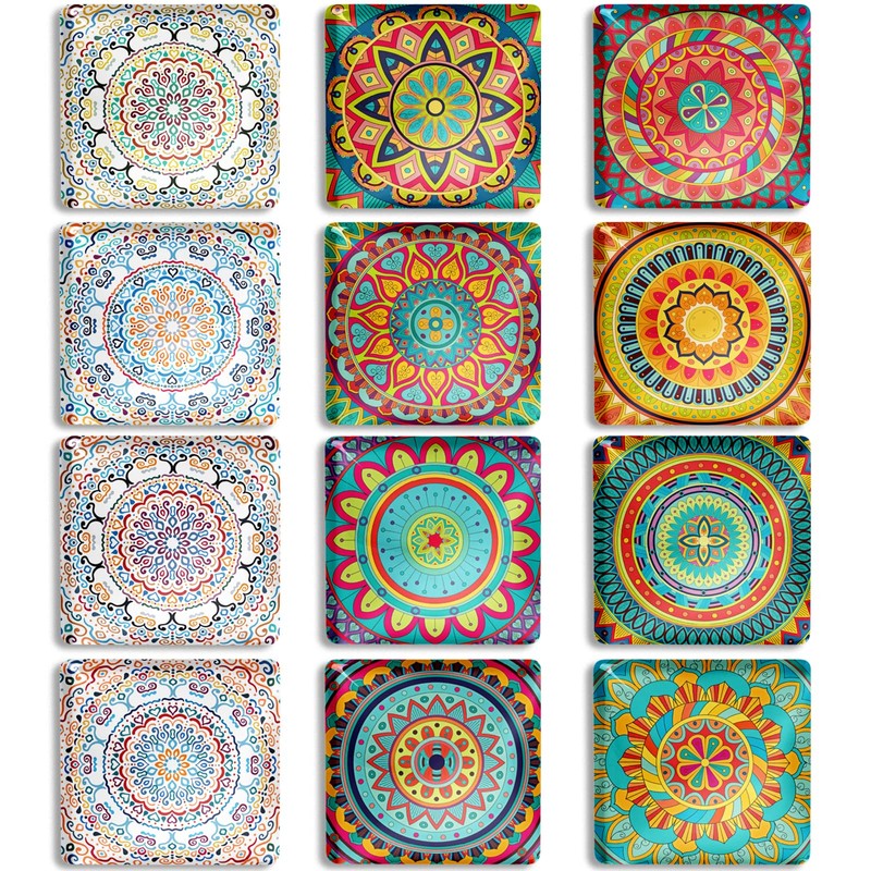 Berkin Arts 12Pcs Cute Square Glass Strong Magnetic Refrigerator Magnet Decorative Fridge Sticker Weave Floral Pattern Flower Mandala Design Yellow Pink Blue Elements for Kitchen