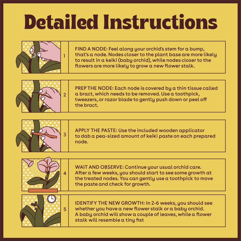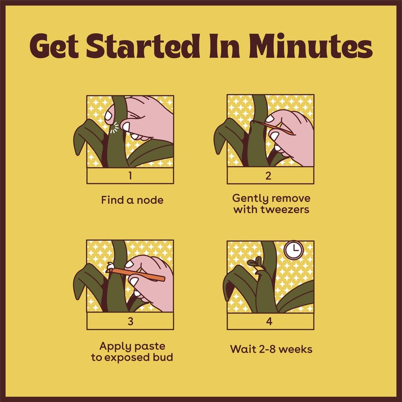 Become a Propagation ProDiscover the joy of watching struggling plants bounce back.Witness the magic of plants care cloning right in your own home.Whether you're a brand-new plant parent or a seasoned green thumbCCit's time to grow more of what you love with an orchid propagation kit!The king of all house plant accessories, keiki plant cloning gel stimulates plants to reproduce rapidly.Leave complex techniques and old-school plant propagation supplies behind.Gel plant cloning paste is all you need to quickly rescue a struggling plant or create a copy of your favorite flower faster.Apply some keiki paste on a barren node and watch new root growth sprout from the stem of the mother plant. Help your orchid grow more children and add more color in your life.Don't give up on struggling plants.Reinvigorate them with plant hormone gel.Multiply your monstera, and reinvigorate your rose bush with plant care accessories that are viable for a variety of species.This growth plant paste is water-resistant to deliver a constant flow of nutrients that won't wash off during regular watering.Made in the USA, this kit comes with a 0.5oz. of paste (2X that of leading competitors), full instructions, and easy-to-use wooden applicators.Increase your odds of cloning success with orchid supplies that bridge the gap between science and nature's miracles.