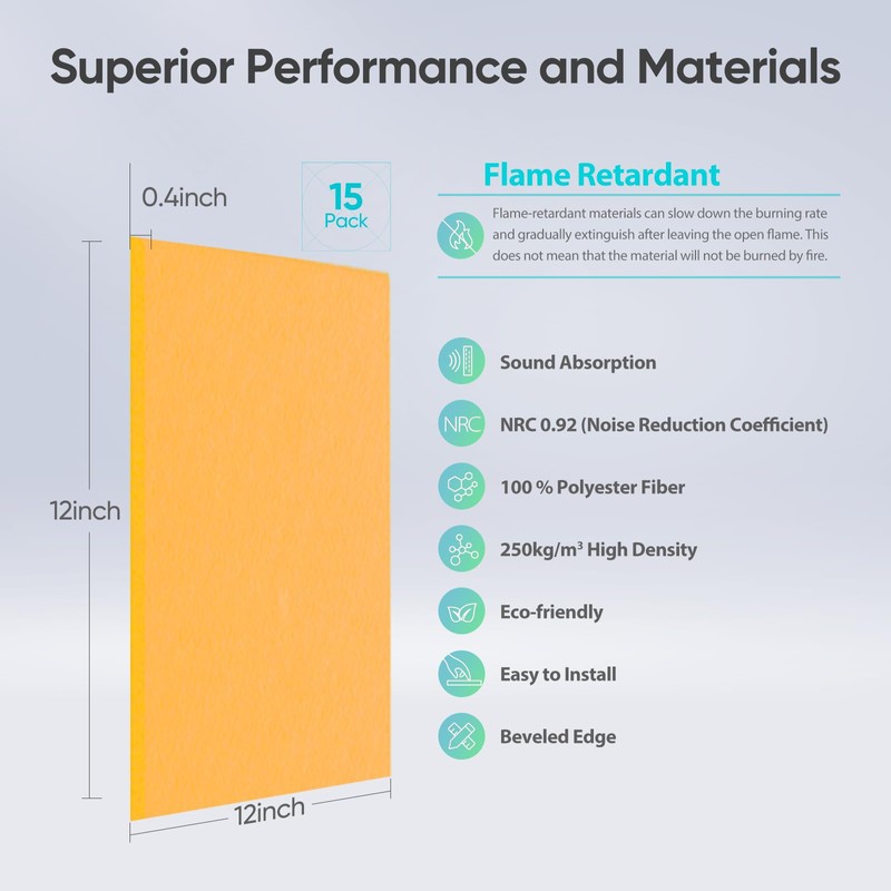 The size of acoustic panels for walls is 12 x 12 x 0.4 inches and a piece of the area is 1 square foot, a total of 15 packs. Made from polyester fiber, the panels effectively absorb sound waves while being flame retardant, making them suitable for use in small to medium-sized rooms. Please note that it is flame-retardant, not fire-resistant.