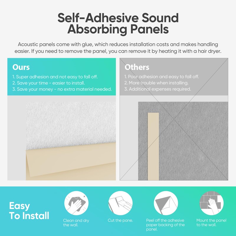 - π§ππππ ππ πππππππ πππ πππππ - Sticky acoustic noise reduction panels have glue on the back, making installation easier and requiring no special tools or materials, saving you cost and time. Simply peel off the backing and attach the panel to the desired location. If you need to clean the noise reduction wall panels, use a vacuum cleaner or clean with a damp cloth.