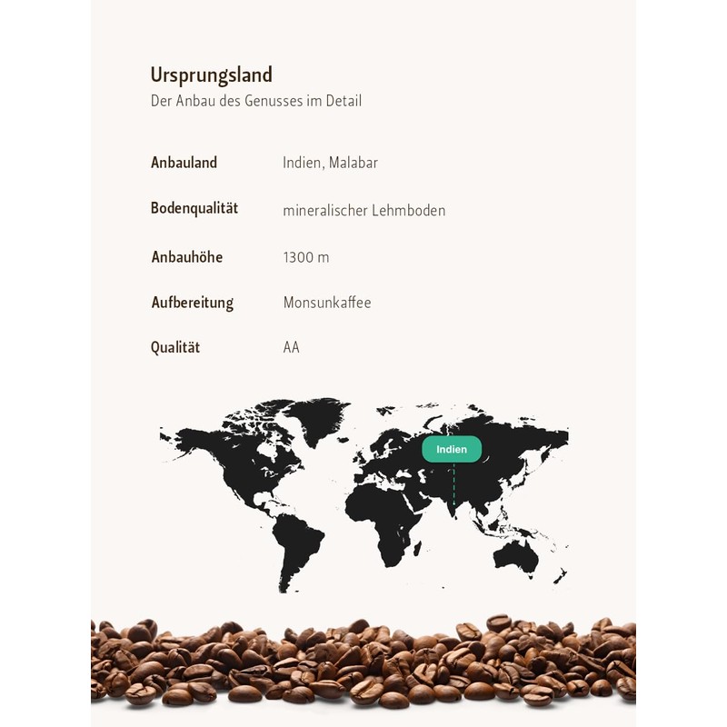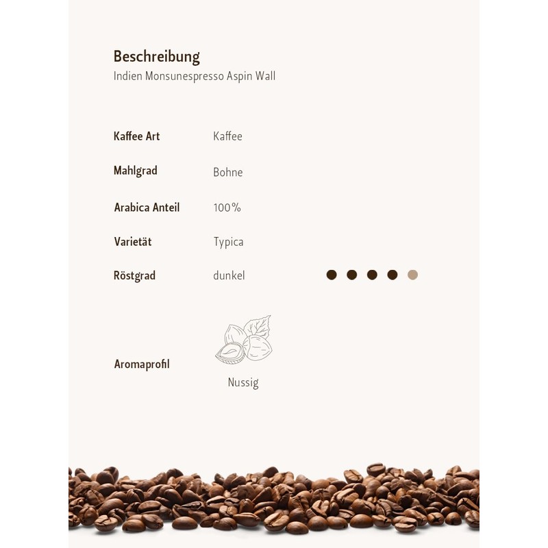 - Contents: Berliner Kaffeerroastei - India Monsunespresso Aspin Wall (500 g/whole bean), roasting coffee degree: dark, 100% Arabica beans, aroma profile: nutty