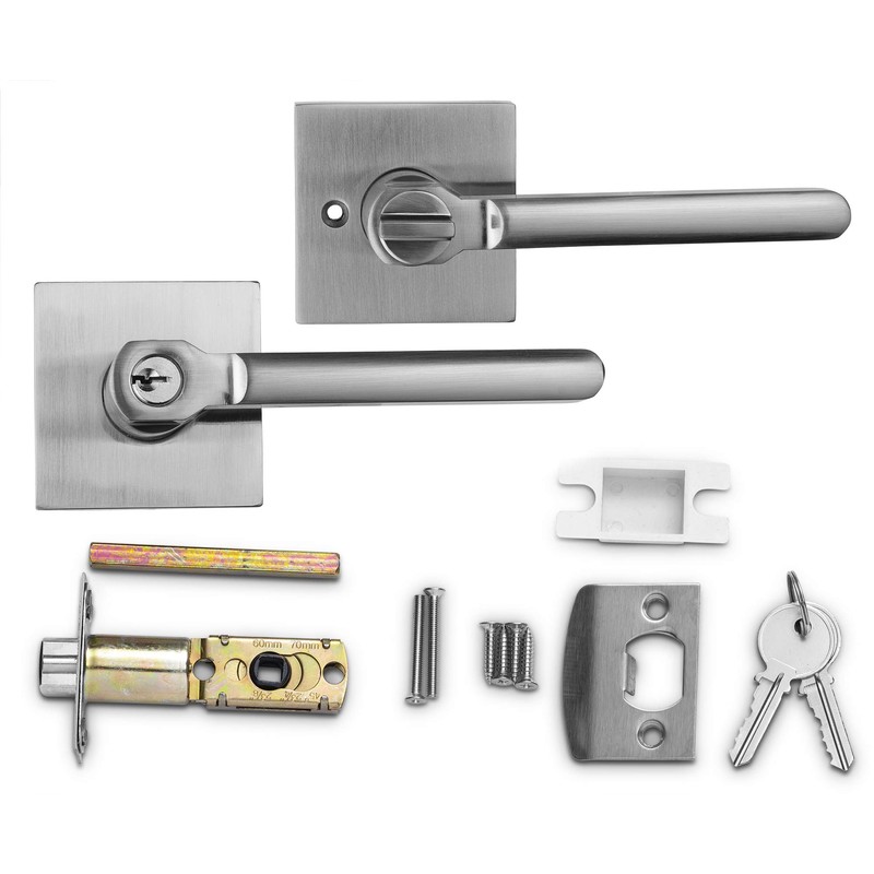 Our Premium Quality Square-Styled Entrance door knobs is an ideal decorative accessory, professionally designed to perfectly compliment a wide range of contemporary and modern, residential interior and exterior doors. This deluxe hardware is creatively fitted with a, reversible, lever handle designed to perform very efficiently, whether it receives a left-handed or right-handed application. This original lockset comes with two keys. It also features a special square-corner striker and an incredibly adjustable latch style which is 60/70mm. and is designed to fit doors between 1-3/8 inch and 1-3/4 inch. It has an Satin Nickel finish and is protected by a clear powder coat finish.