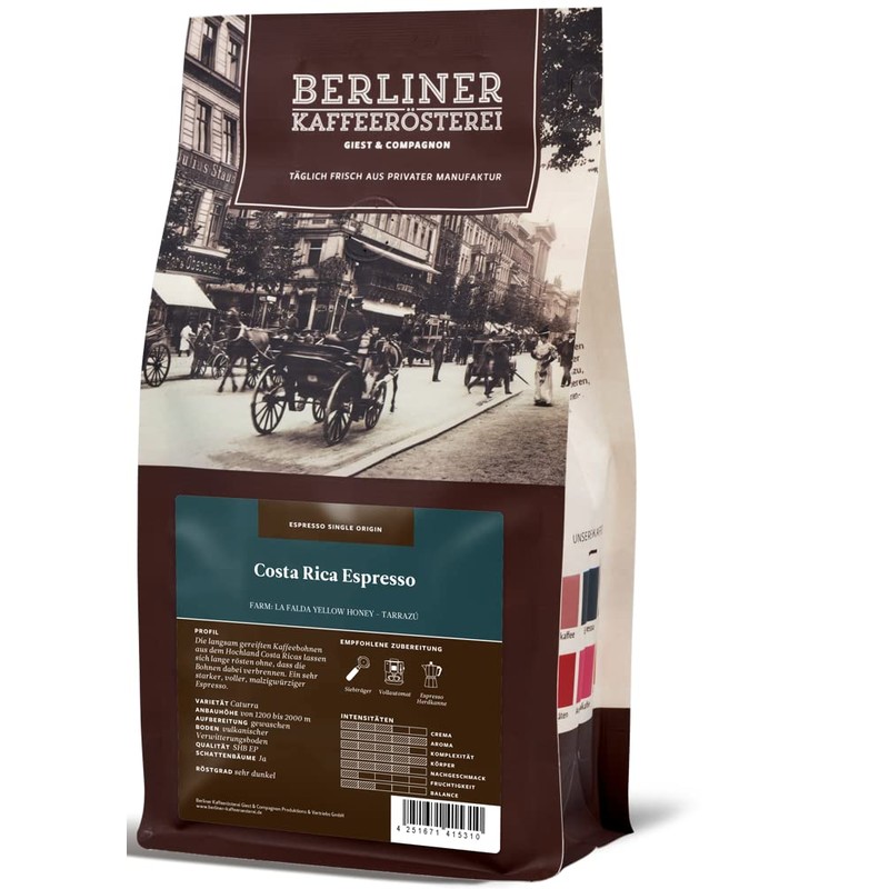 - Contents: Berlin coffee roasting - Costa Rica Espresso (250 g / ground), roasting degree coffee: very dark, 100% Arabica beans, aroma profile: caramely/roasty