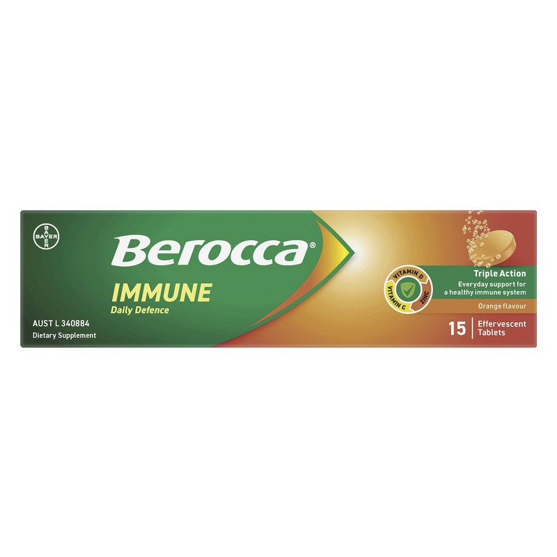 Berocca Immune Daily Defence is an advanced triple action formula that is scientifically formulated with a high dose of vitamin C (1000 mg), vitamin D and zinc to support all three layers of the immune system and support your body's daily immune defences. Berocca Immune Daily Defence is an advanced triple action formula that is scientifically formulated with a high dose of vitamin C (1000 mg), vitamin D and zinc to support all three layers of the immune system and support your body's daily immune defences. Start your day with Berocca Immune Daily Defence to support your immune system health all year round.