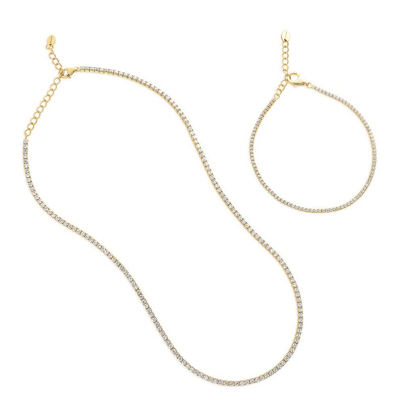 Refined and radiant, our petite matching tennis bracelet and choker necklace set is a versatile duo that pairs perfectly with any outfit for an understated yet stunning look. Crafted with fine 925 sterling silver, yellow gold flashed, nickel free. (BRACELET) Set with premium grade 1.23 ct.tw round cubic zirconia CZ (1.5mm) in prong setting. Adjustable chain measures 7" in length with 1" extension, 1.6mm in width. Lobster claw clasp. (NECKLACE) Set with premium grade 4.74 ct.tw round cubic zirconia CZ (2mm) in prong setting. Adjustable chain measures 14" in length with 2" extension, 2mm in width. Lobster claw clasp. Imported.