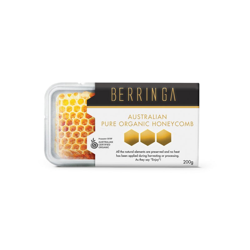 Berringa Honeycomb is a delicious combination of 100% Australian Eucalyptus Honey and Honeycomb packed in a sealed tub. Guaranteed to be Australian Certified Organic (ACO), you can be sure of the purity and superior quality of this product. Delicious and versatile, honeycomb adds a gourmet flair to any meal. It looks great as part of a cheese or antipasto platter, can be broken up and sprinkled onto desserts and breakfast dishes, or simply eaten the same way you would honey from a jar.