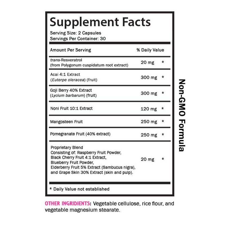 - RESVERATROL COMLEX: Our powerful dietary supplement designed to support a balanced internal environment and promote optimal well-being. This advanced formula combines the natural benefits of Trans-Resveratrol, Acai 4:1 Extract, Gojl Berry 40% Extract, Noni Fruit 10:1 Extract, Mangosteen Fruit, Pomegranate Fruit (40% extract), Raspberry Fruit Powder, Black Cherry Fruit 4:1 Extract, Blueberry Fruit Powder, Elderberry Fruit 5% Extract, and Grape Skin 30% Extract (skin and pulp) with a blend of potent ingredients known for their properties.
