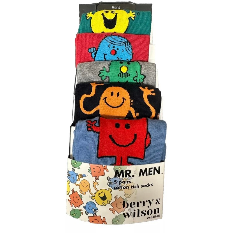 - DESIGN FEATURES: Set of 5 pairs of men's cotton-rich socks featuring beloved Mr. Men characters in vibrant colours on contrasting backgrounds