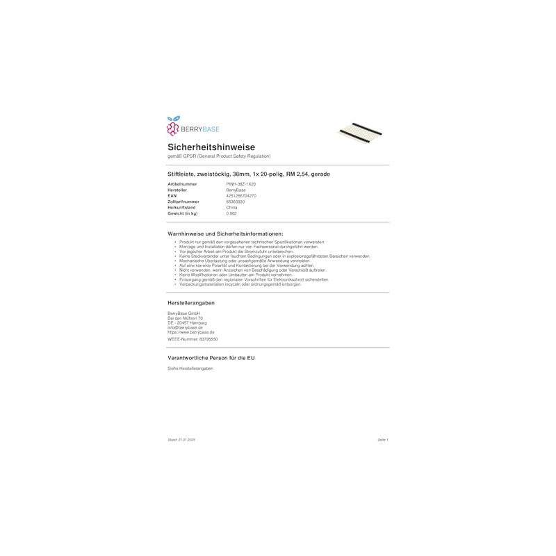 - Box contents: 1 x BerryBase pin header 1 x 20 pin, 38 mm; speed camera shipping within 1-2 working days from Germany.