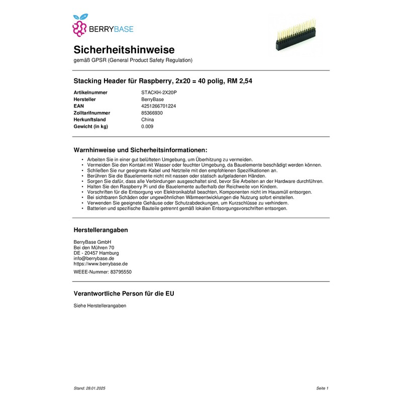 BerryBase Stacking Header for Raspberry, 2 x 20 = 40 Pin, RM 2.54